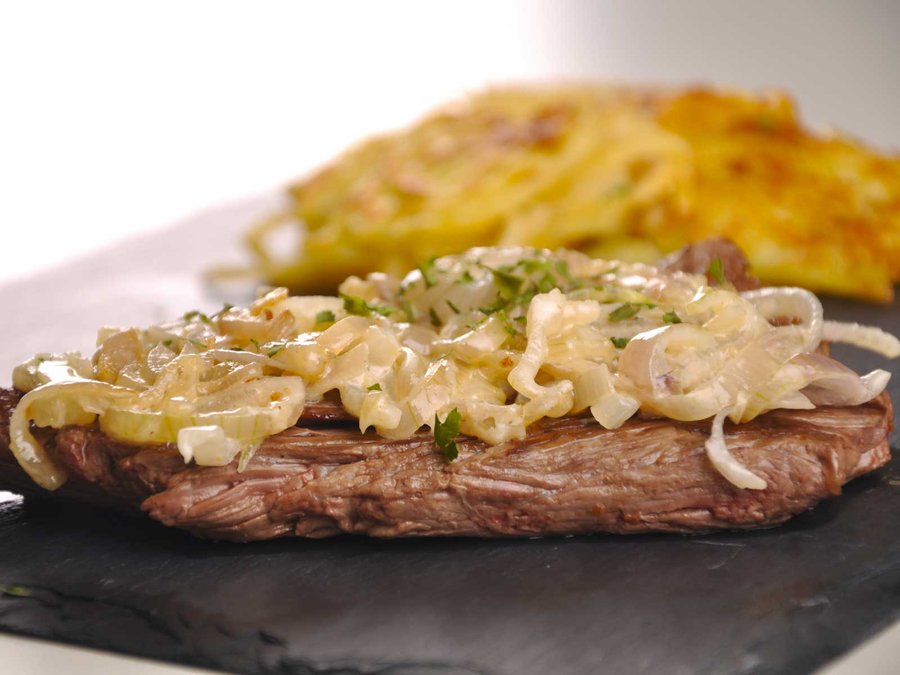Un tendre morceau de boeuf cuit selon votre préférence et accompagné d’échalotes confites. Flank steak with shallot.